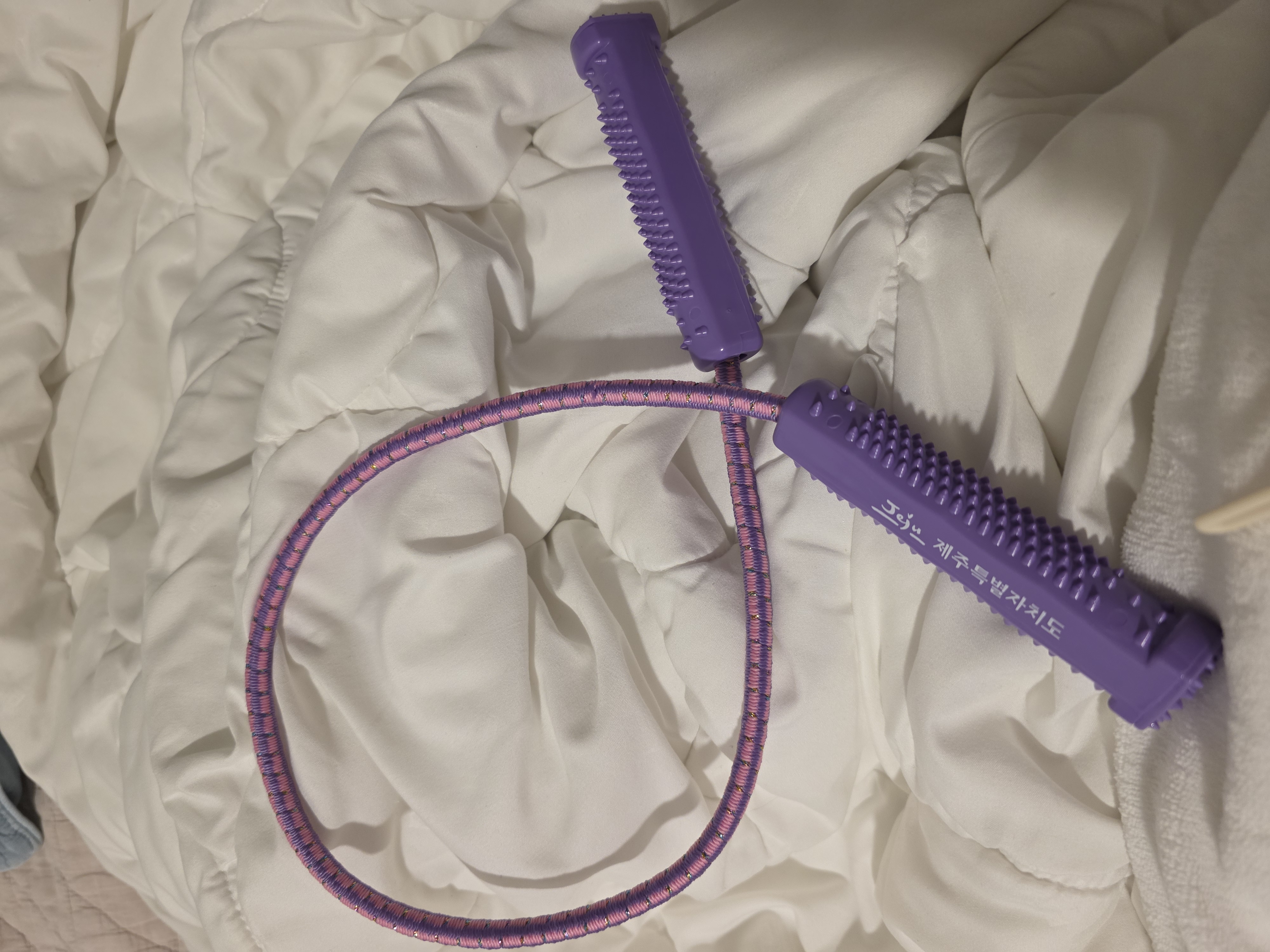 제가 선택한 제품의 특징: 손잡이 부분에 지압 돌기가 있는 보라색 튜빙 밴드.