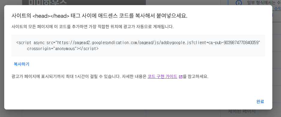 4. 구글에서 가져온 하단의 코드를 티스토리에 적용해준다.