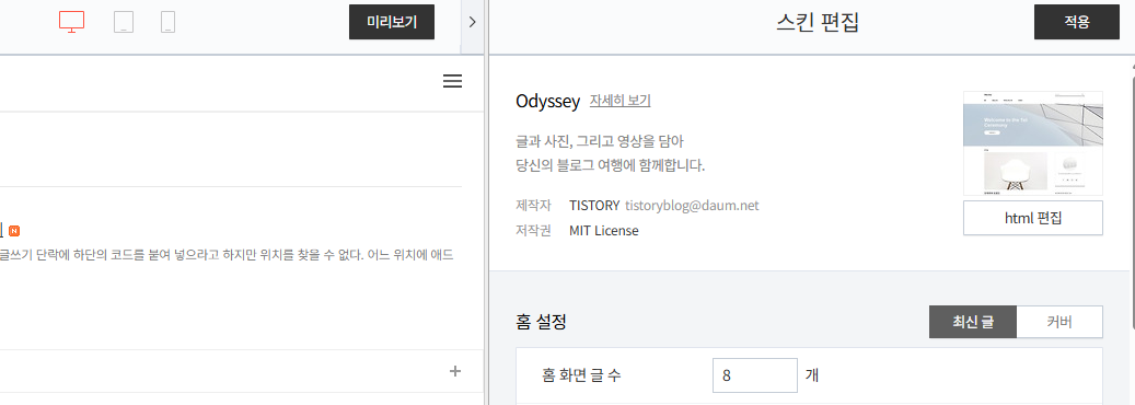 3. 블로그관리>스킨편집>으로 들어오면, html편집 되는 부분이 있다.