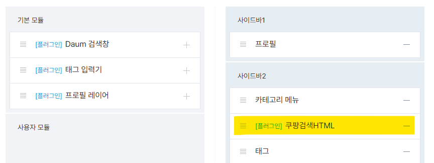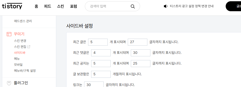 그리고 나면 티스토리>블로그관리>좌측메뉴에 꾸미기> 사이트바로 들어가서 사이트바를 설정해주면 되요.