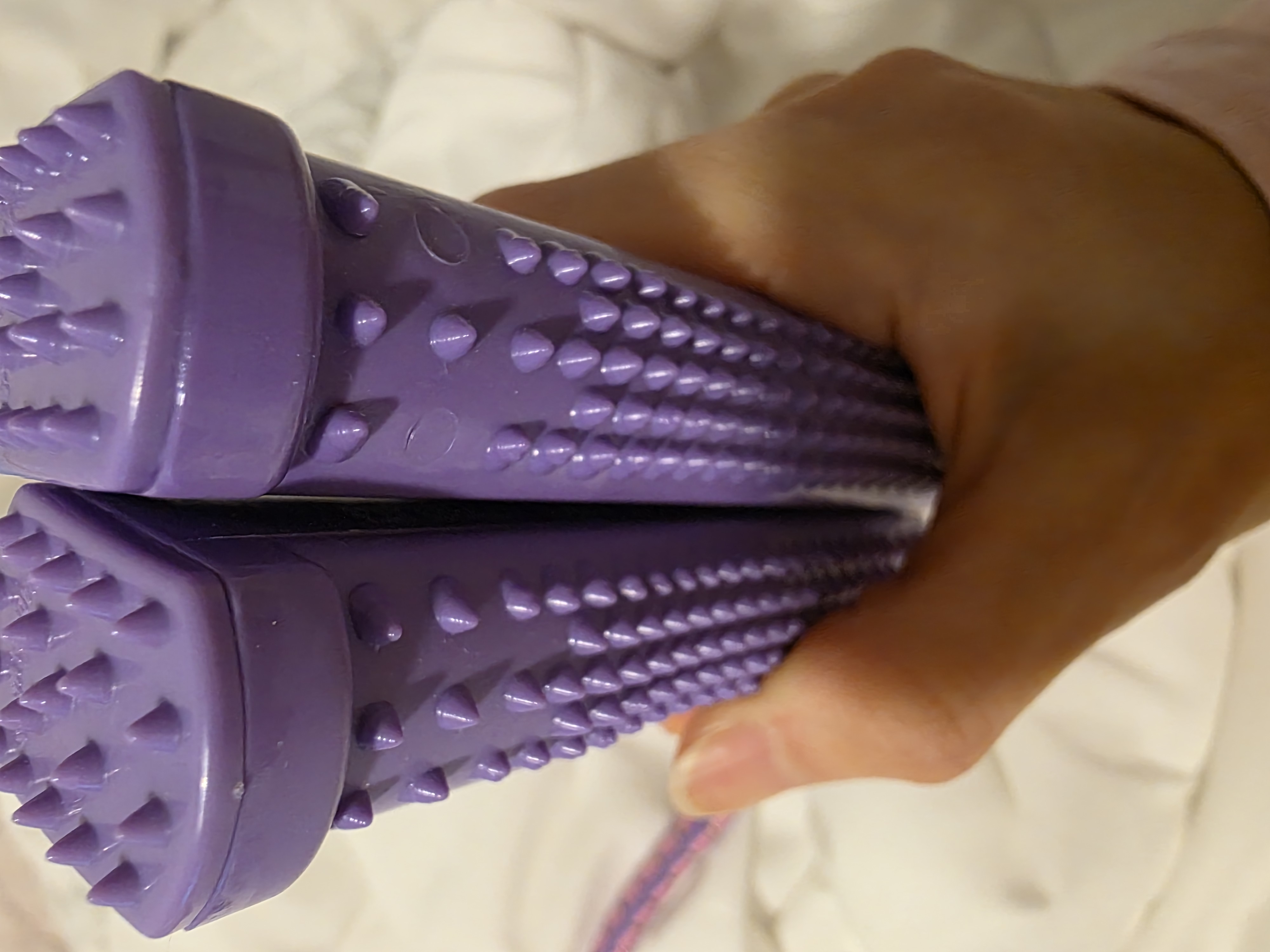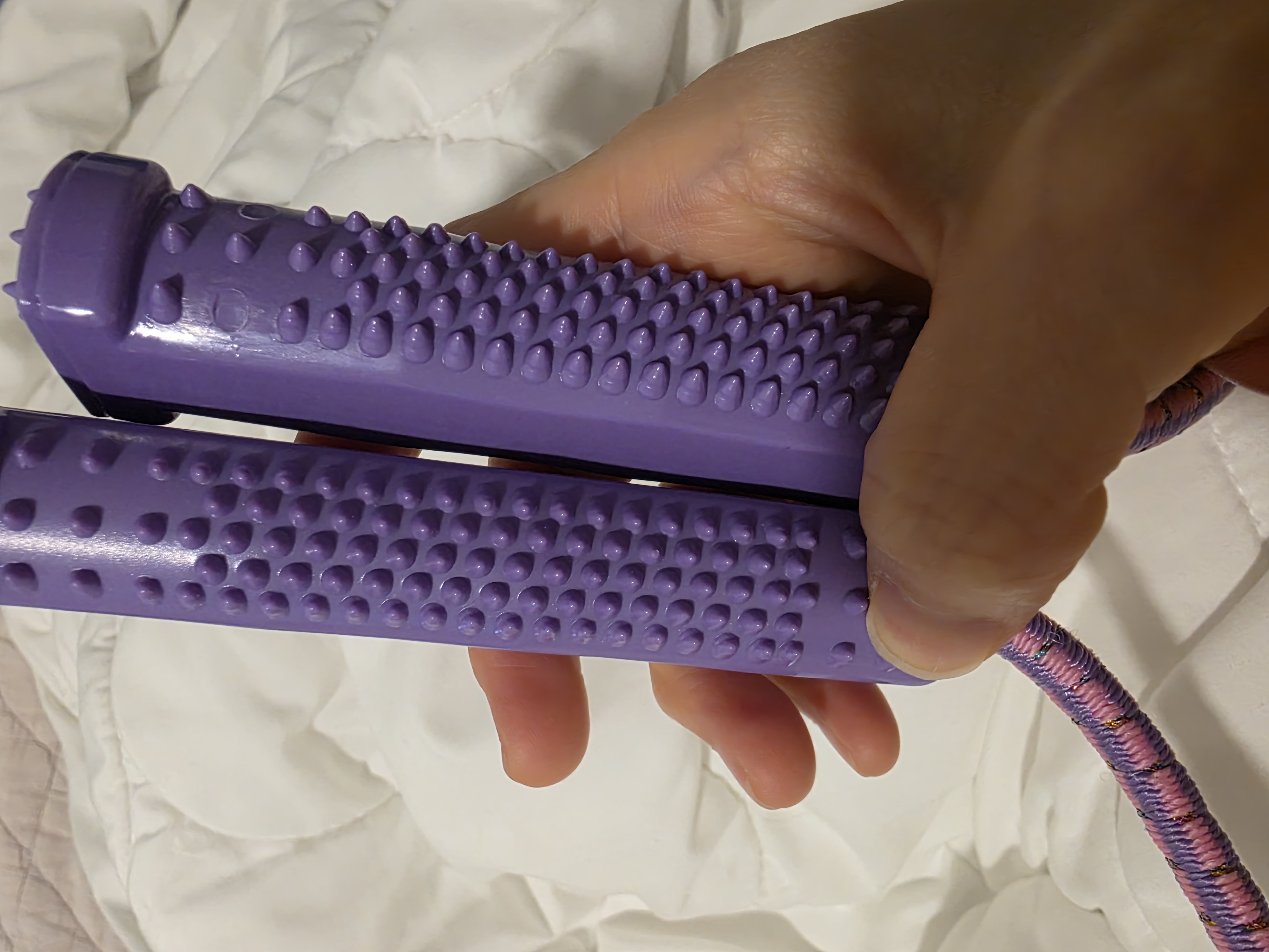 제가 선택한 제품의 특징: 손잡이 부분에 지압 돌기가 있는 보라색 튜빙 밴드.